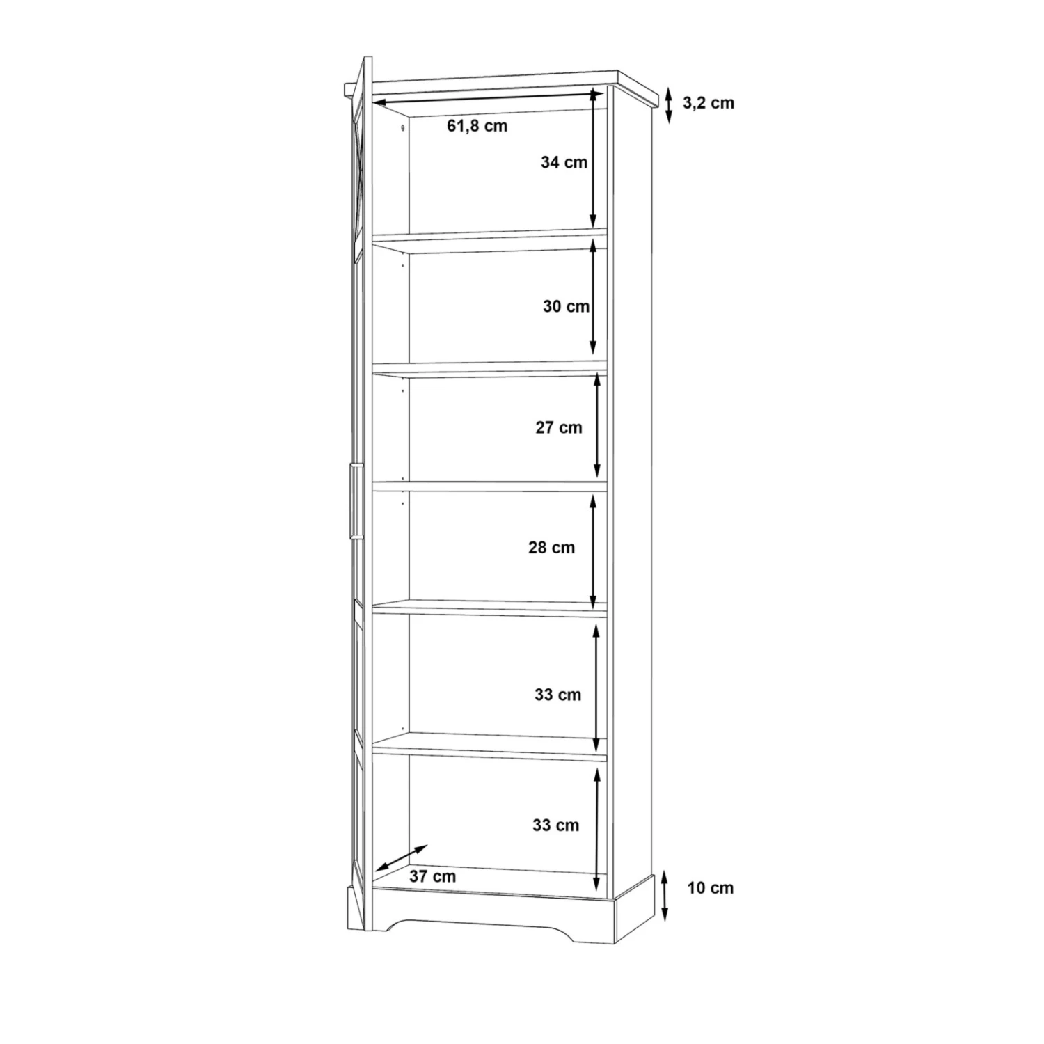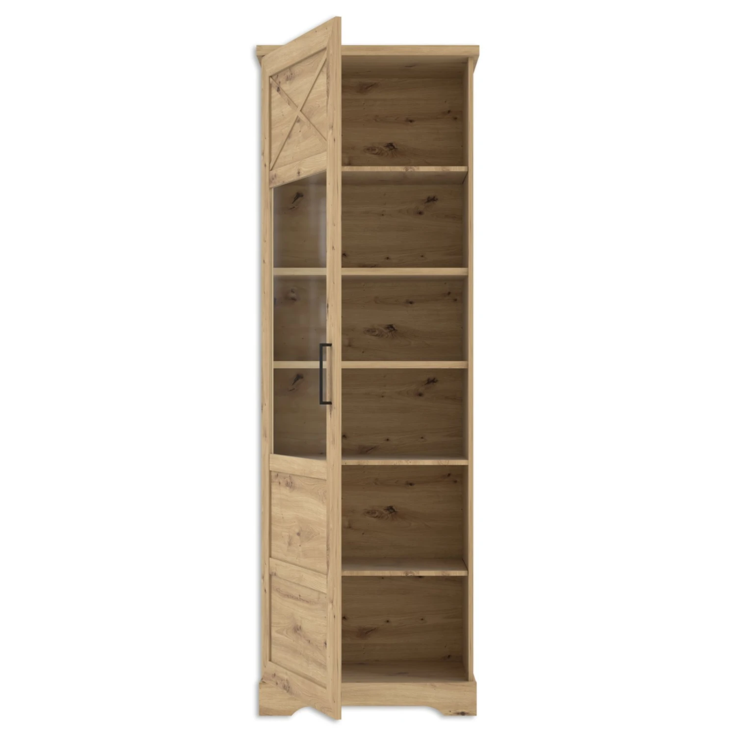 Diese Vitrine hat ein robustes Auftreten. Sie ist aus Holz und in Artisan Eiche Nachbildung gehalten. Hinter der großen Drehtür mit Glaseinsatz befinden sich 5 Einlegeböden, den den Innenraum nützlich aufteilen. Die Griffe sind aus schwarzem Metall.