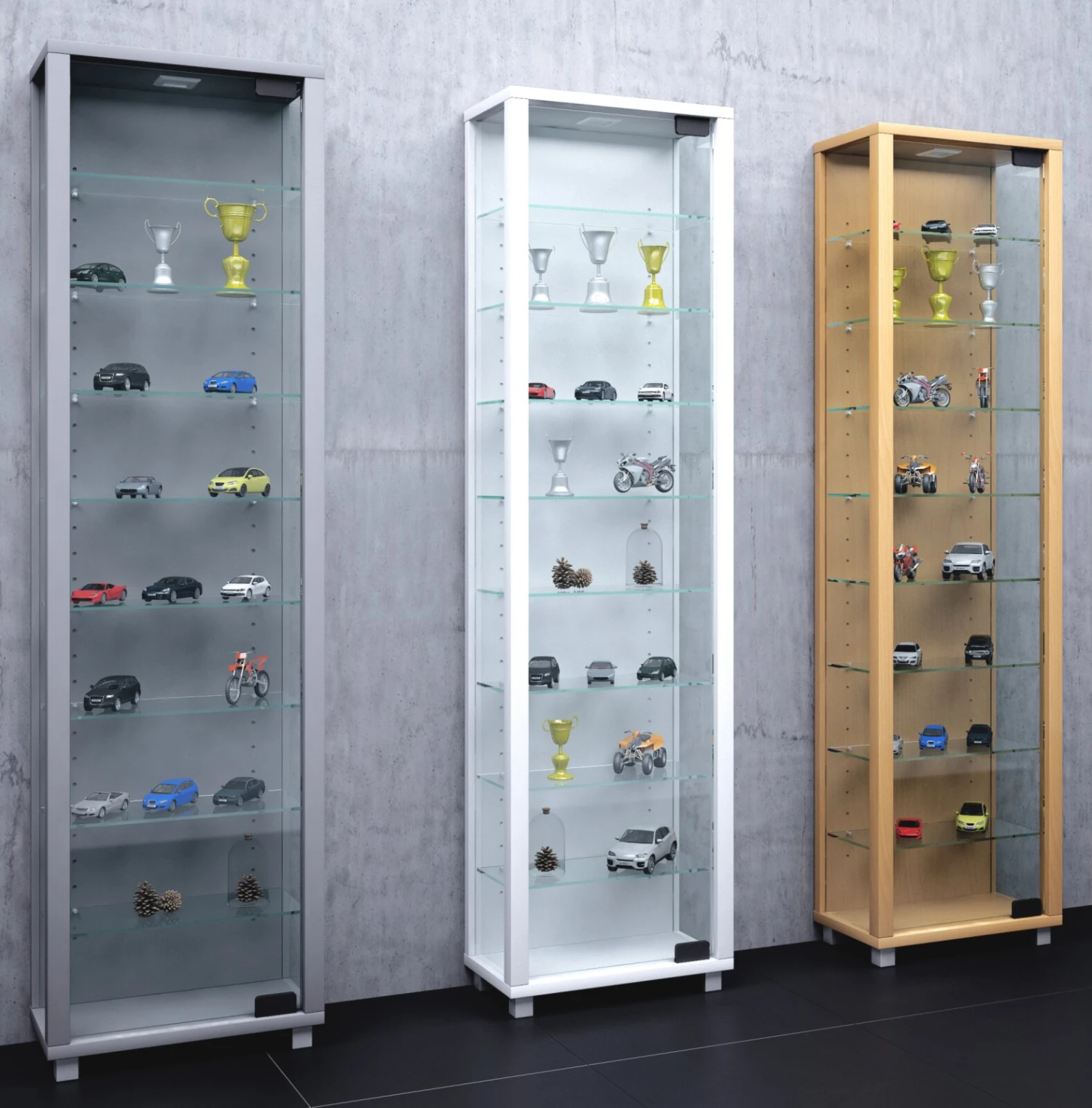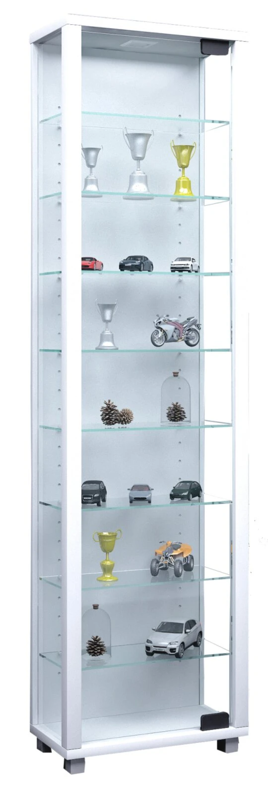 Vitrine EDANA MAXI in Weiß mit Wänden und Böden aus ESG-Sicherheitsglas und einer stabilen Rückwand. Die Vitrine verfügt über acht Einlegeböden und vier zeitlose Füße sorgen für sicheren Stand. Die Liebe zum Detail macht diese Sammelvitrine zu etwas ganz Besonderem.