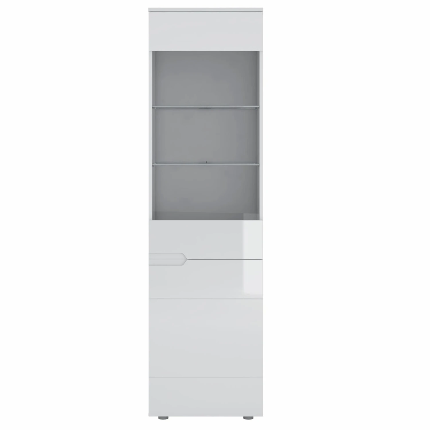 Die zweitürige Vitrine bietet Platz für Dekorationen und für weitere Gebrauchsgegenstände, die unsichtbar verstaut werden sollen. Die weiße Farbgebung lässt sich mit den unterschiedlichsten Einrichtungsstilen kombinieren und das Design dieser tollen Vitrine wird Modernität in Ihrem Wohnraum versprühen. Das besondere Etwas erlangt sie durch die hochglänzende Front.