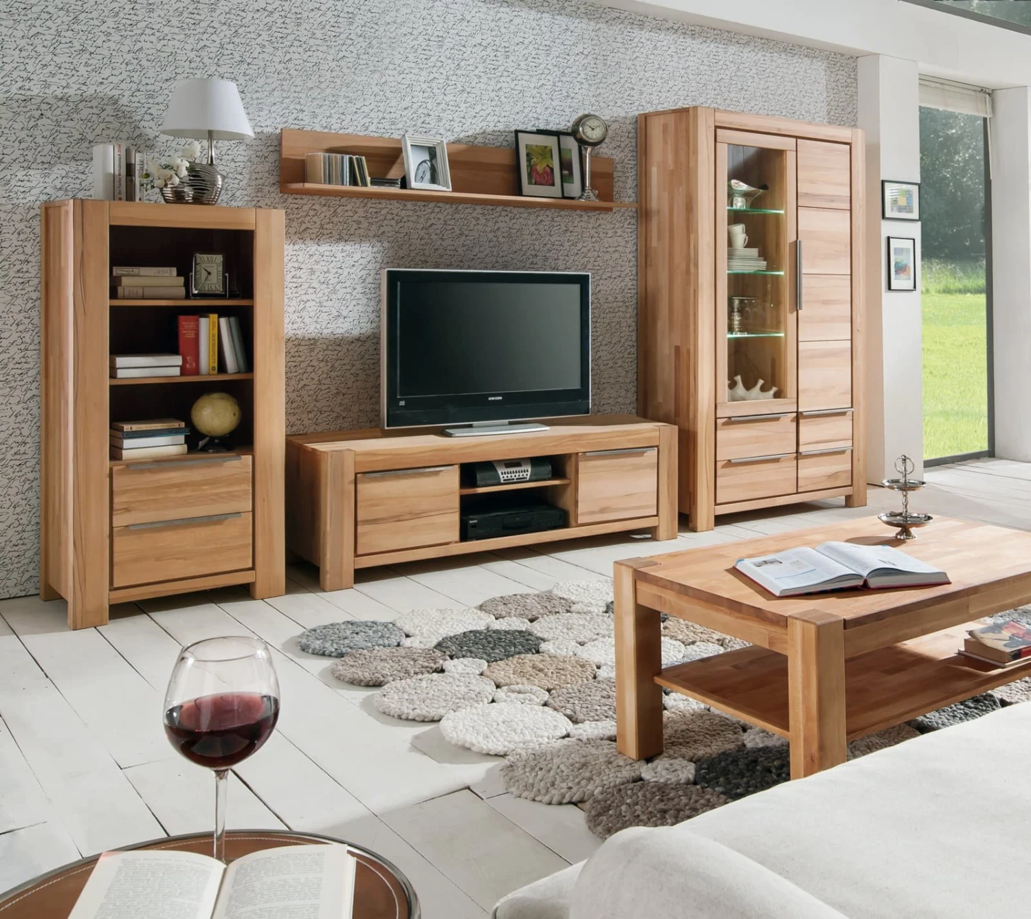 Umfangreich ausgestattete Vitrine aus Kernbuche Massivholz mit Glaselementen. Diese robuste Vitrine ist mit 3 Glasböden hinter der Glastür und 3 Holzeinlegeböden hinter der Holztür ausgestattet. Zudem befinden sich gleich 4 Schubladen im unteren Bereich.
