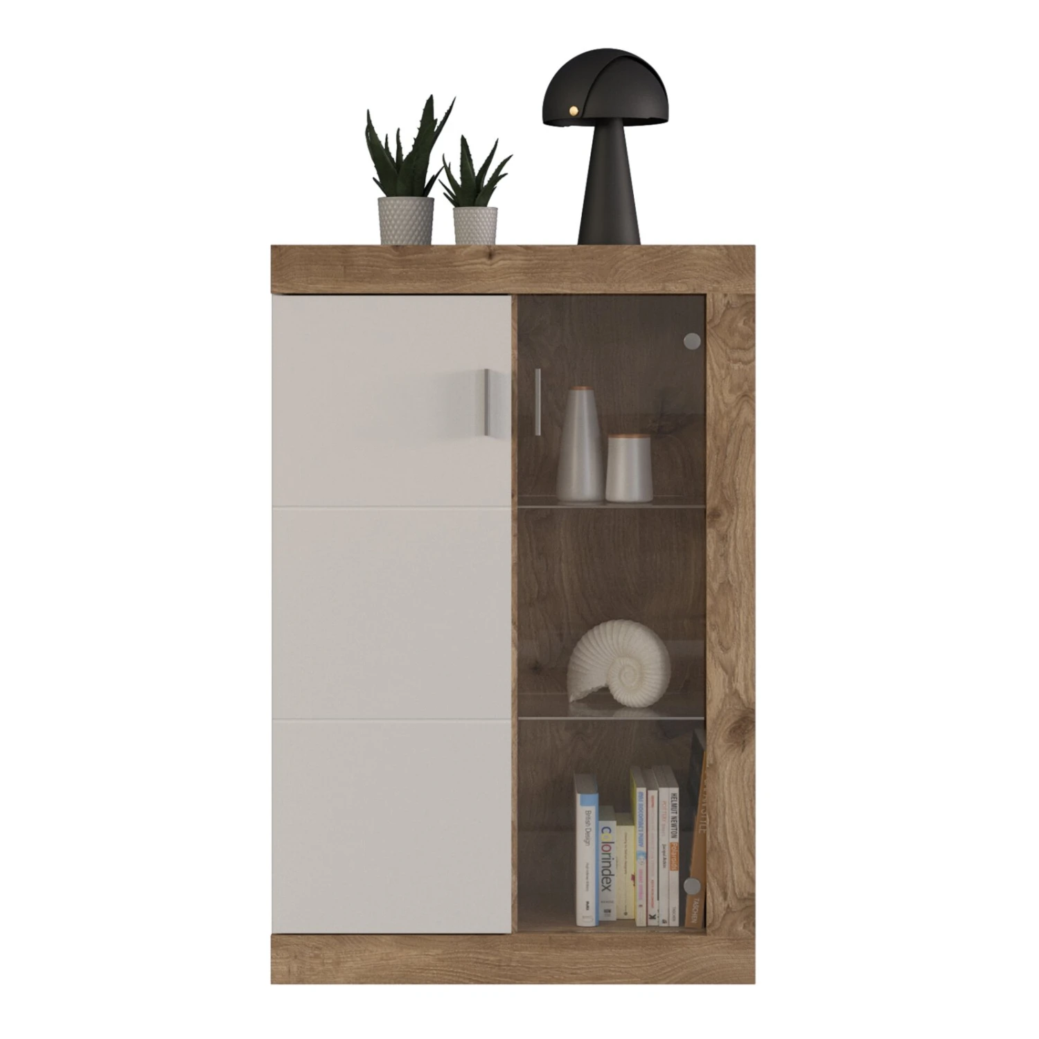 Die schlichte, weiß matte Vitrine mit Absetzungen in Viking Oak Nachbildung verfügt über Tiefziehfronten, die das Gesamtbild optisch auflockern. Hinter einer Tür und einer Glastür lassen sich Utensilien und Dekorationsartikel unterbringen.