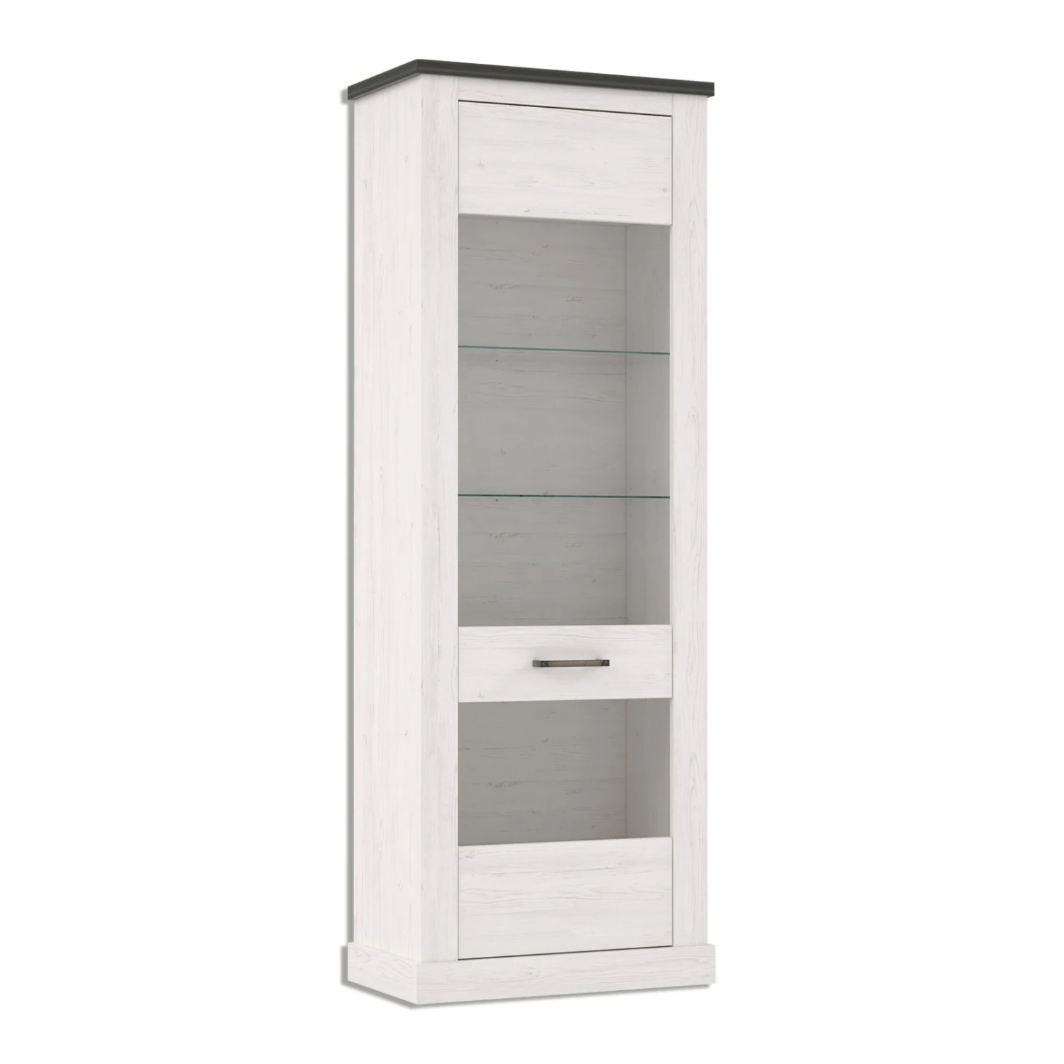 Wunderschöne Standvitrine im modernen Landhausstil. Der Korpus ist in Pinie weiß Nachbildung gehalten, der Absatz in Touchwood Nachbildung und der Griff ist aus gebürstetem Metall. Hinter der Tür befinden sich drei Ablageböden aus Holz und zwei Einlageböden aus Glas.