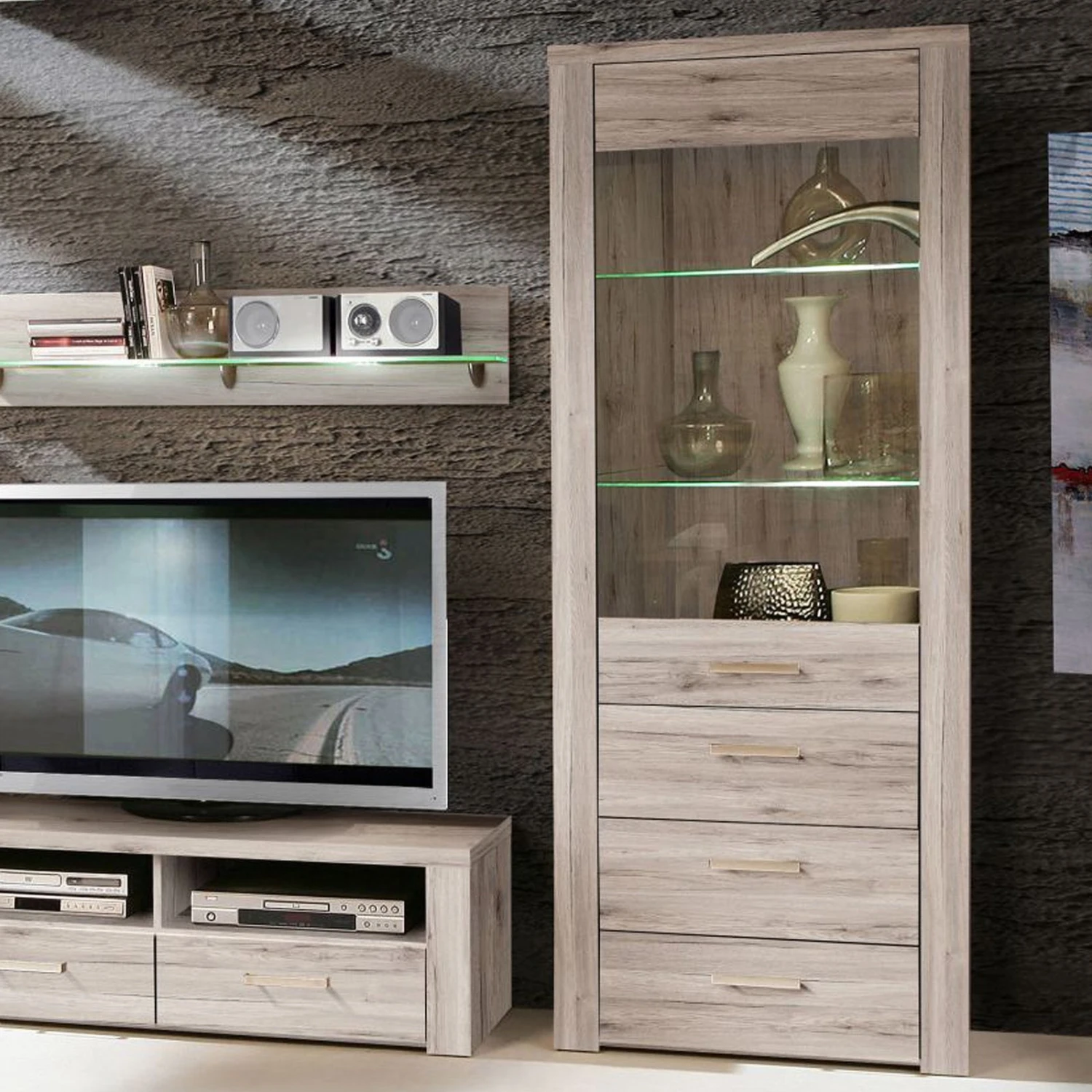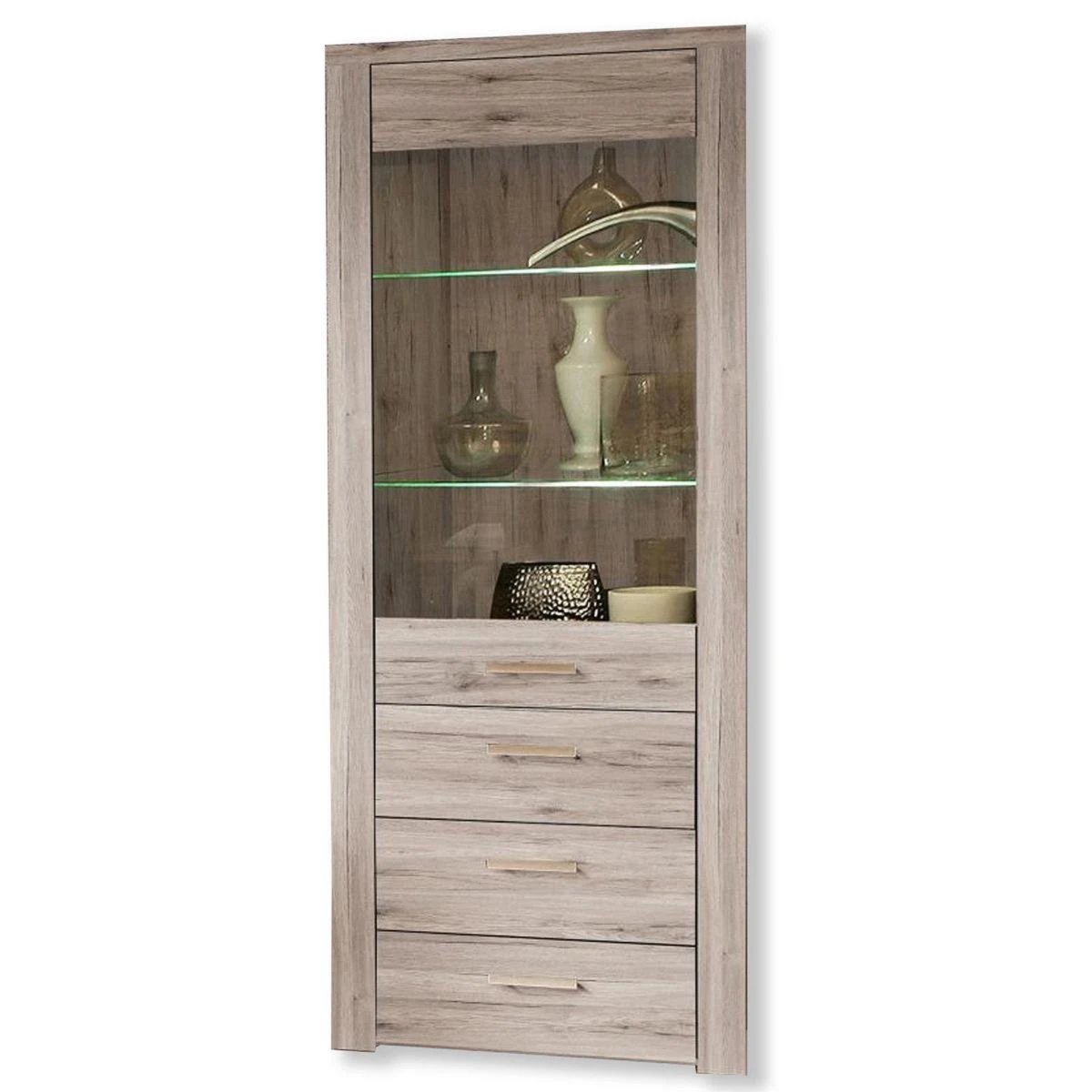 Moderne Vitrine mit viel Stauraum und Beleuchtung. Die Vitrine verfügt über 1 Glastür mit zwei Einlegeböden und drei Schubkästen. Edelstahlgriffe sorgen zusätzlich für eine wunderschöne Optik. Ein schöner Hingucker für Ihr Wohnzimmer.