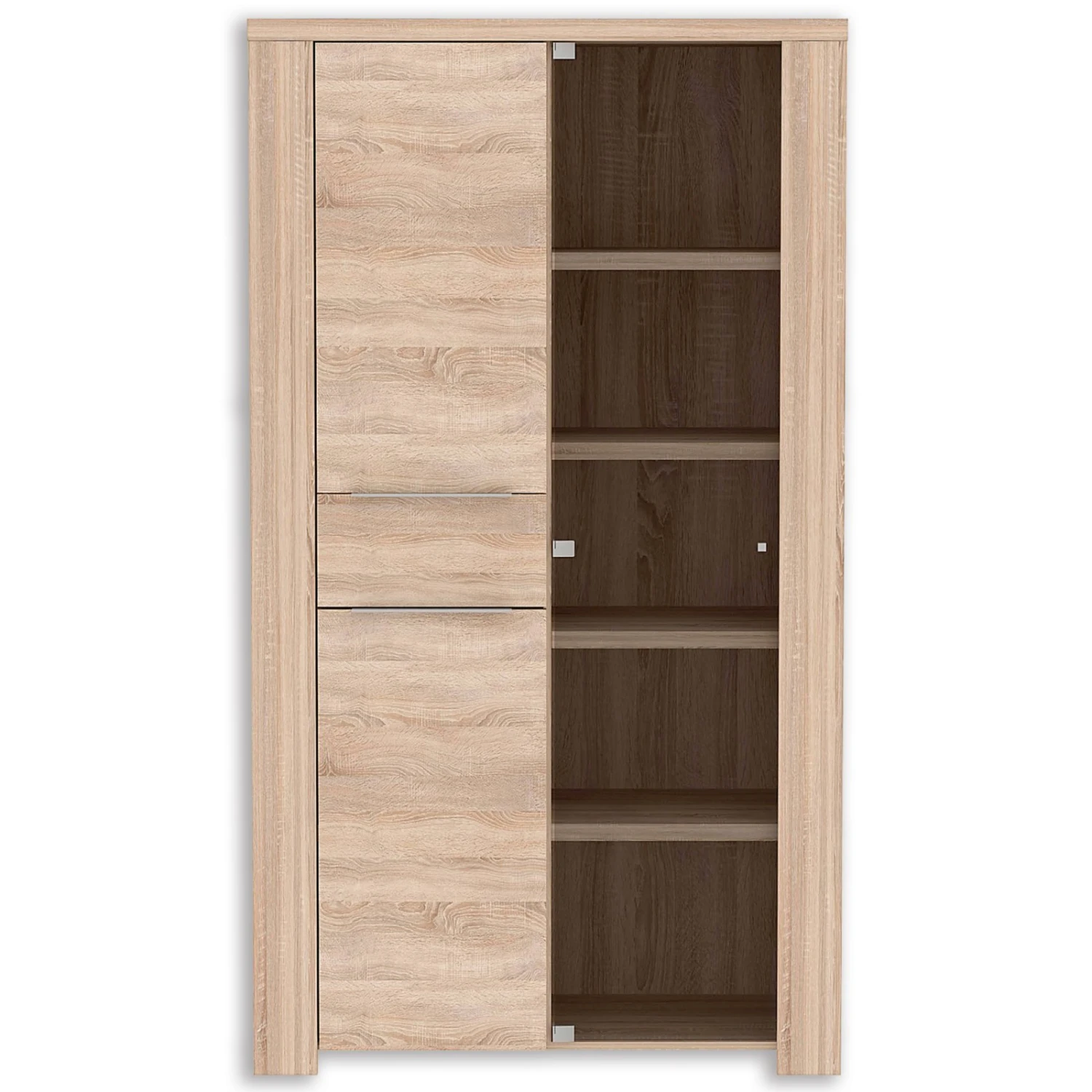 Top aktuelles Wohn- und Speisezimmerprogramm in der Farbe Sonoma Eiche – Edles und Modernes für Ihr Esszimmer. Die schicke Vitrine mit zwei Holz- und einer Glastür und vier Einlegeböden sieht toll aus und bietet Ihnen Stauraum. Das Sonoma Eiche Dekor und die Metallgriffe erzeugen eine moderne Optik, die in Ihrem Esszimmer perfekt zur Geltung kommen wird.
