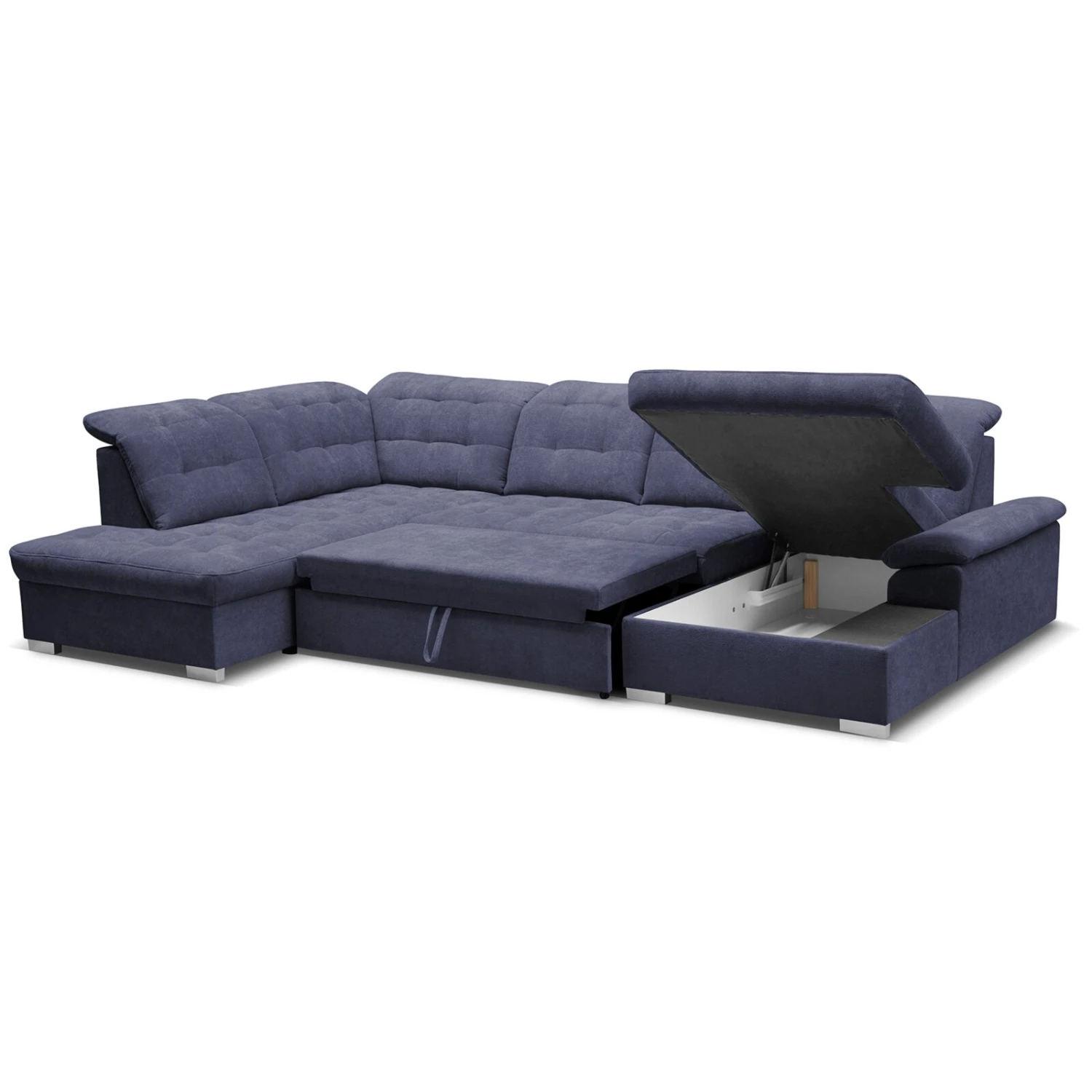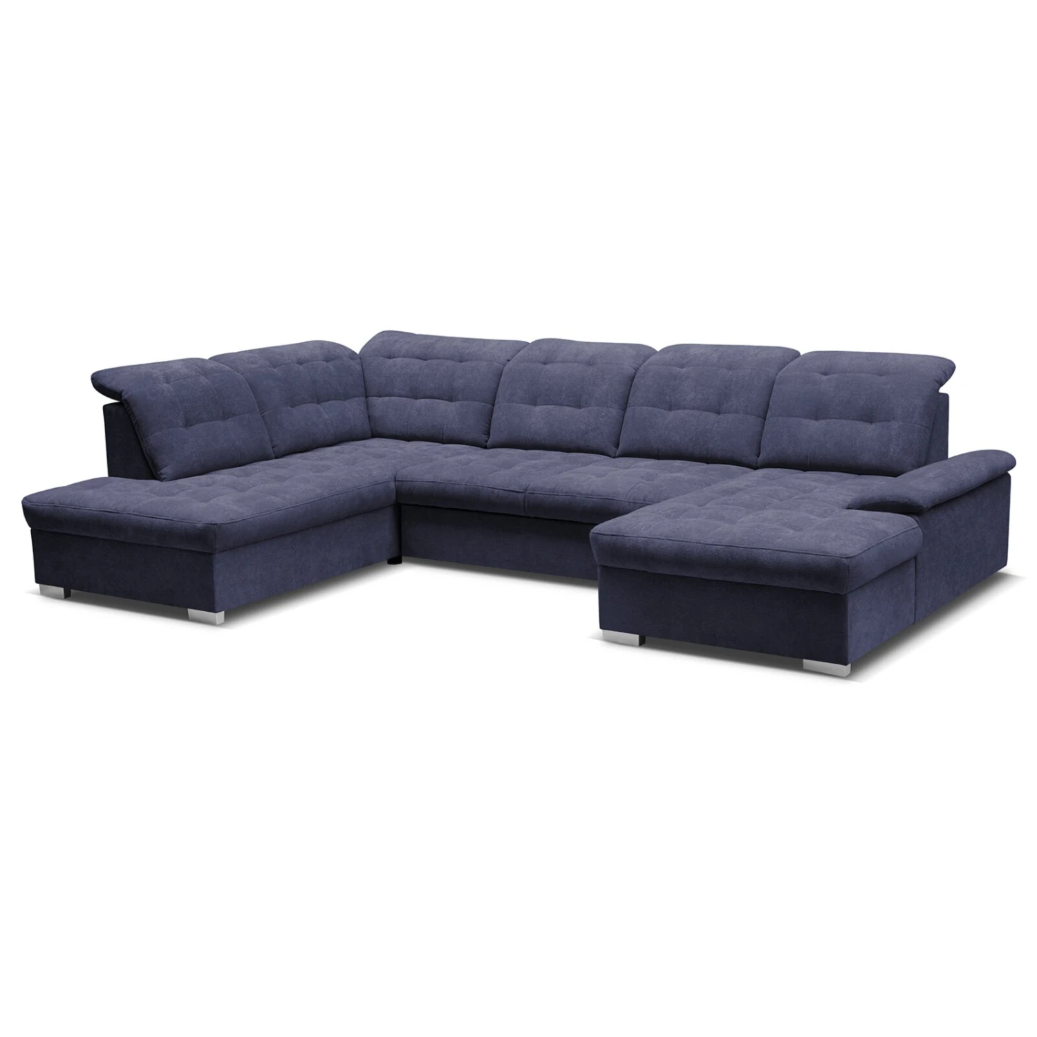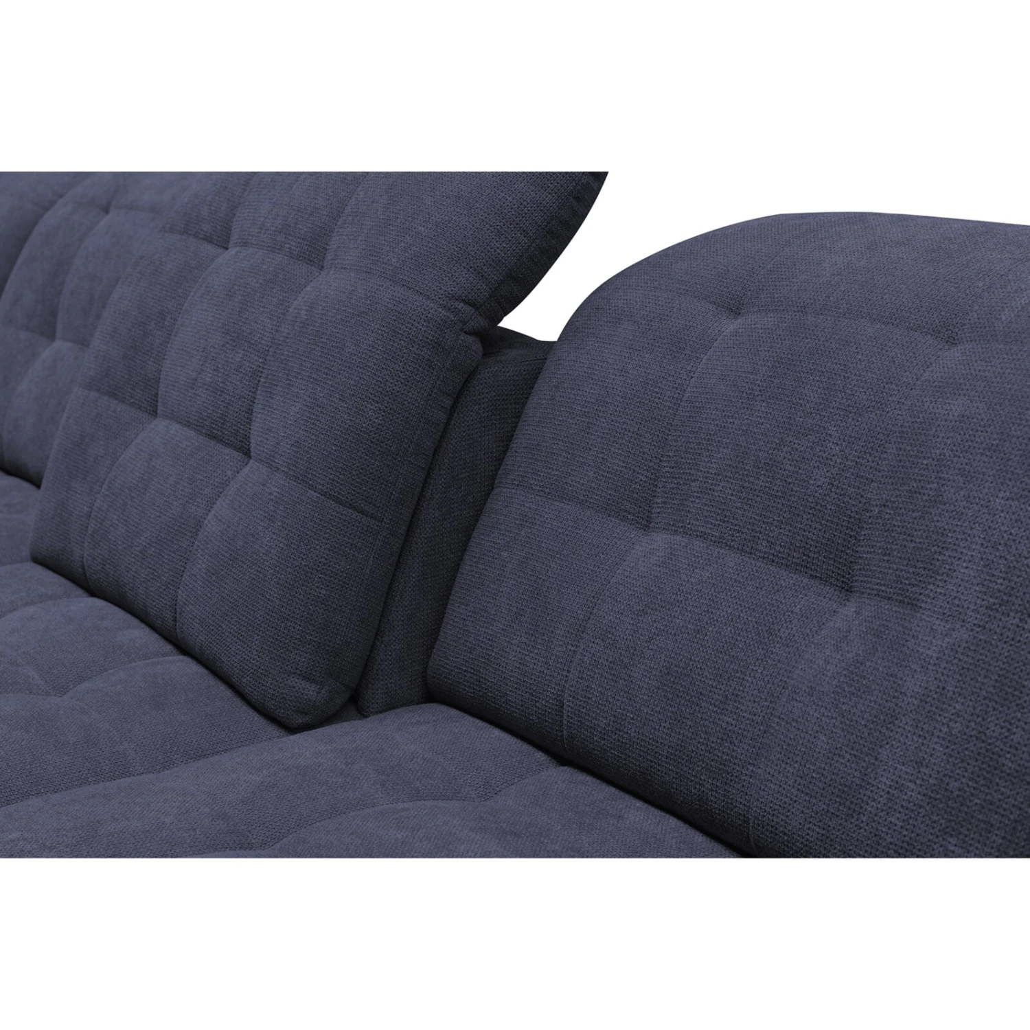 Diese blau-graue Wohnlandschaft ist die reinste Wohlfühloase und mit tollen Funktionen ausgestattet. Für höchsten Komfort sorgen die Kopfteil- und Sitztiefenverstellung, die Sie beliebig verstellen können. Das Kopfteil lässt sich in sechs Stufen variieren und die Sitztiefe kann vierstufig verstellt werden. Zudem können Sie die integrierte Liegefunktion optimal für spontane Übernachtungsgäste nutzen. Die dafür notwendigen Kissen und Decken lassen sich bestens im Staukasten unterbringen.