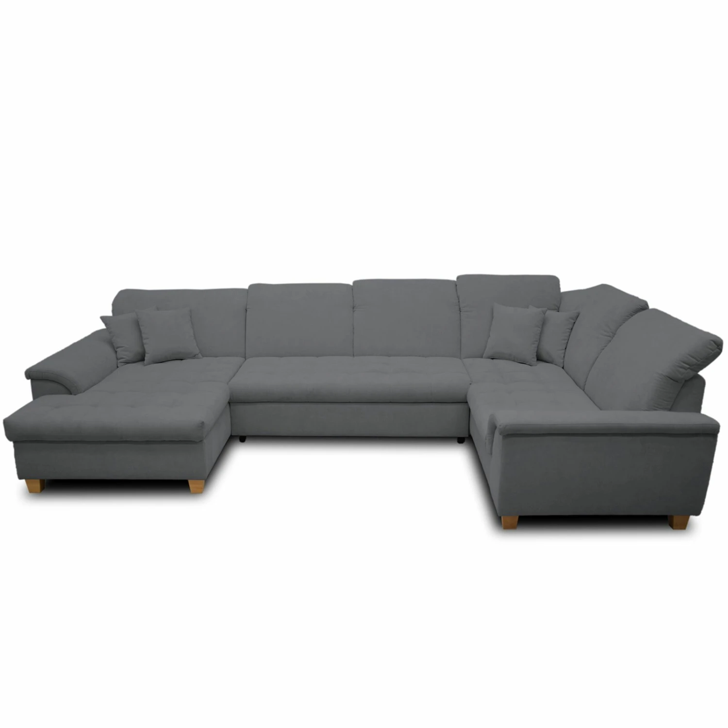 Auf dieser bequemen Wohnlandschaft lassen sich stressige Arbeitstage vergessen! Der schicke dunkelgraufarbene Bezug sieht elegant aus und passt hervorragend zu einem modernen Einrichtungsstil. Für einen angenehmen Sitzkomfort sorgen der Polyätherschaum und die Wellenfederung. Für zusätzlichen Komfort sorgt die Kopfteilverstellung. Zudem ist der Rücken mit dem Originalstoff bezogen, somit kannst du die Wohnlandschaft problemlos mittig im Raum platzieren.