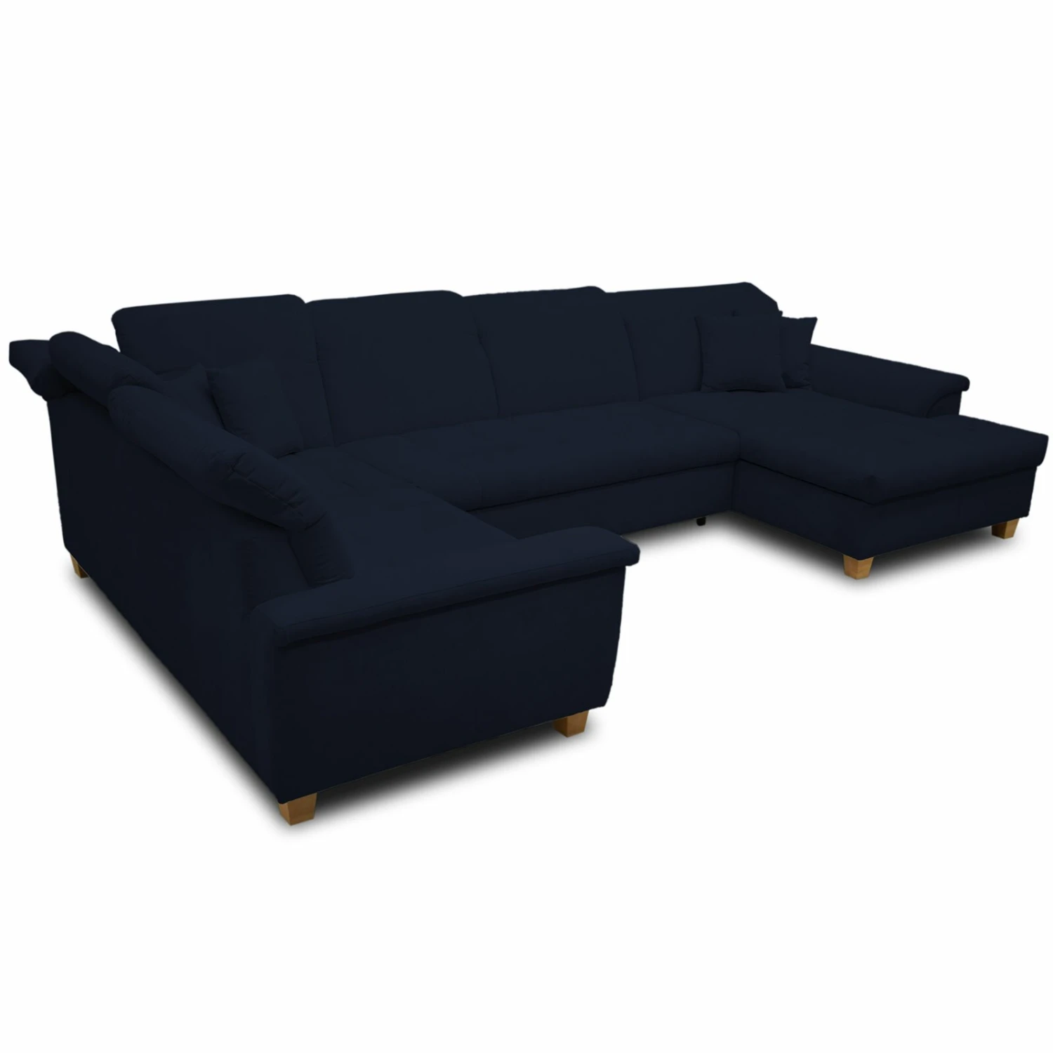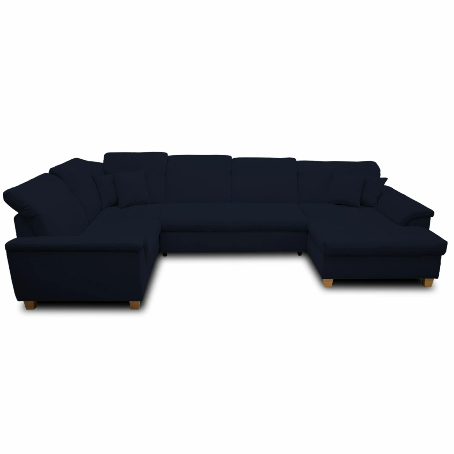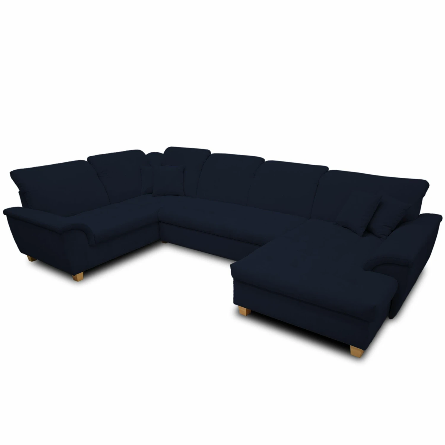 Auf dieser bequemen Wohnlandschaft lassen sich stressige Arbeitstage vergessen! Der schicke marinefarbene Bezug sieht elegant aus und passt hervorragend zu einem modernen Einrichtungsstil. Für einen angenehmen Sitzkomfort sorgen der Polyätherschaum und die Wellenfederung. Für zusätzlichen Komfort ist die Wohnlandsschaft mit der Kopfteilverstellung ausgestattet. Zudem ist der Rücken mit dem Originalstoff bezogen, somit kannst du die Wohnlandschaft problemlos mittig im Raum platzieren.