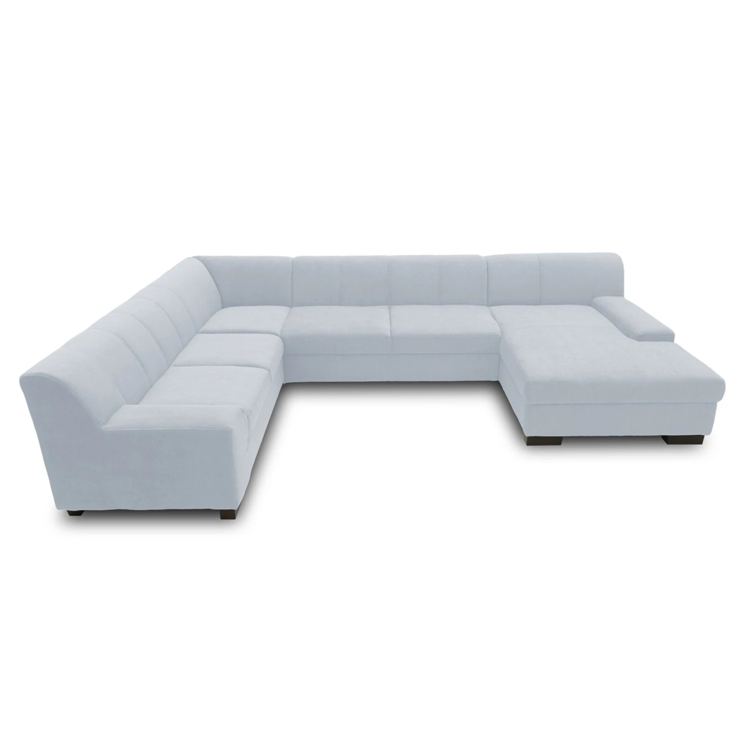Auf dieser riesigen Wohnlandschaft in Pastellblau findet die ganze Familie Platz! Durch den Bezug aus Microfaser ist sie robust und strapazierfähig. Für einen angenehmen Sitzkomfort sorgen der Polyätherschaum und die Wellenfederung. Das Design wird abgerundet durch die wengefarbenen Füße aus Holz. Zudem ist der Rücken mit dem Originalstoff bezogen, um die Wohnlandschaft auch mittig im Raum platzieren zu können.