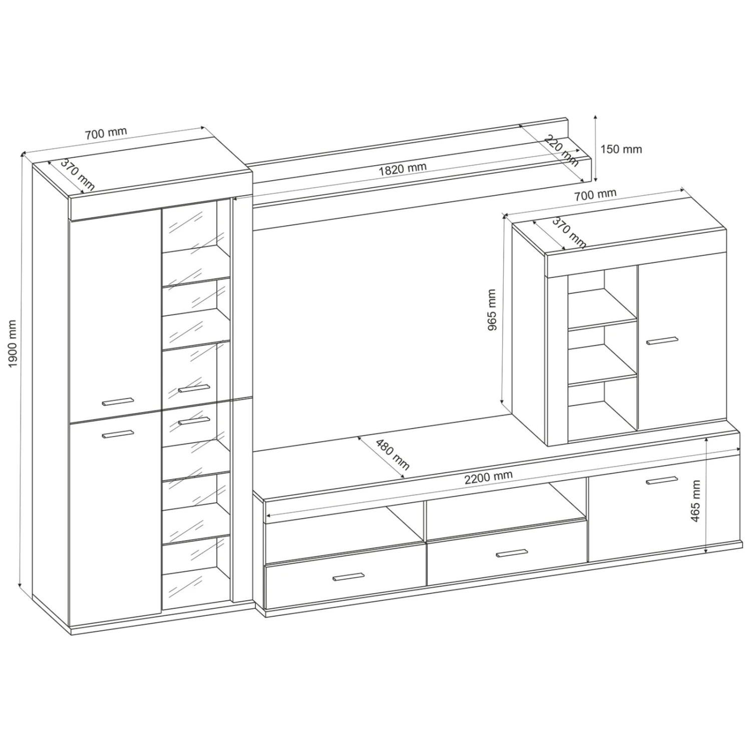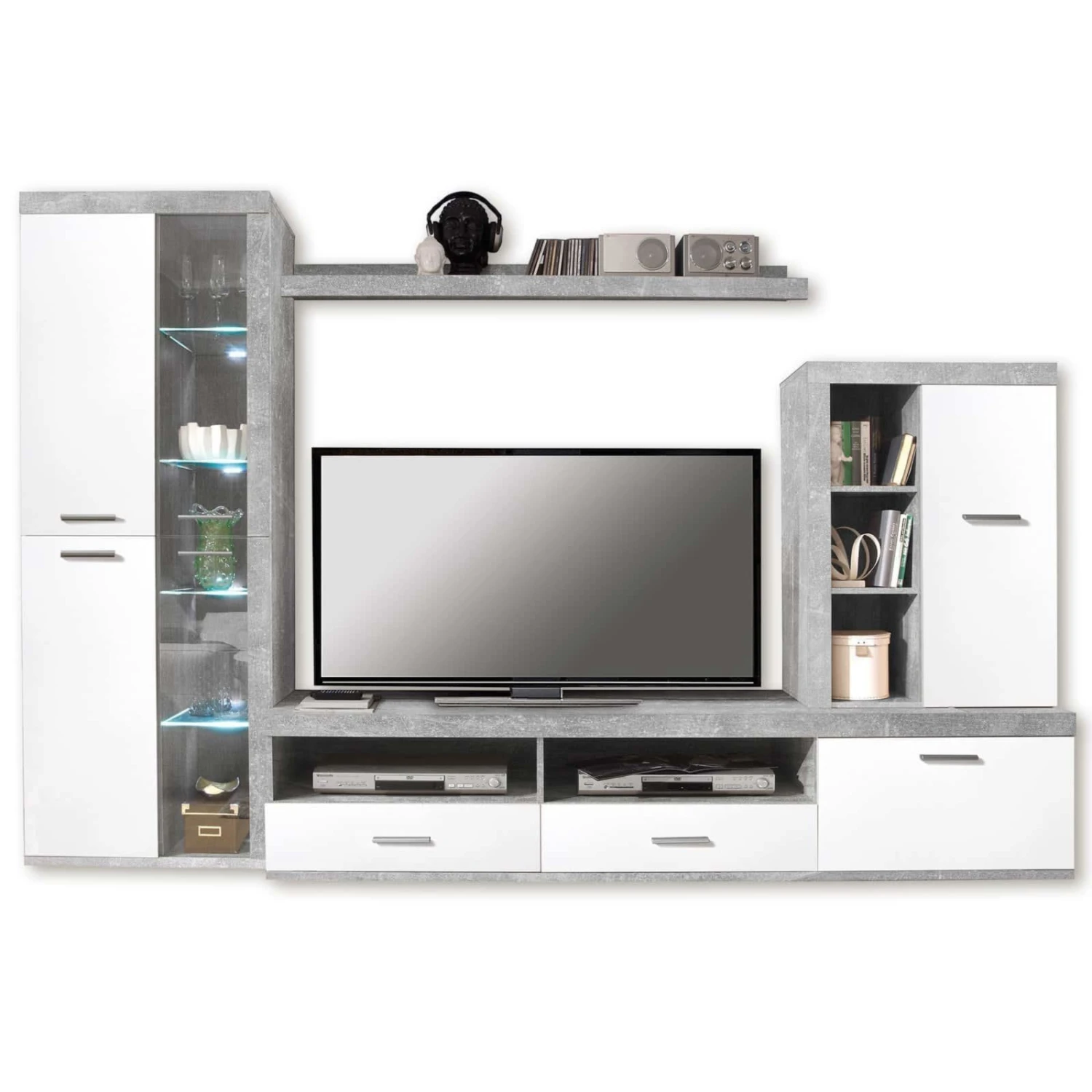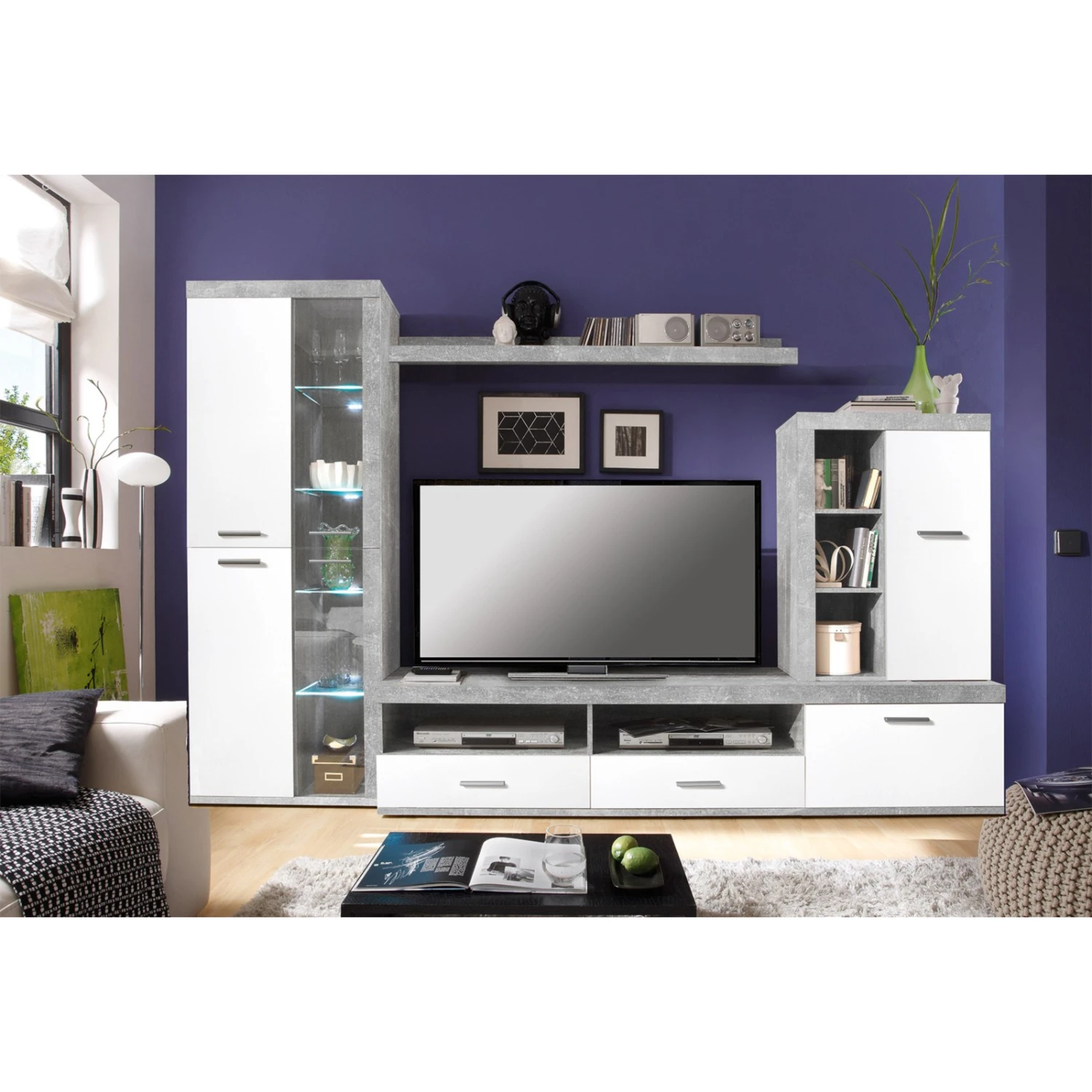 Diese Wohnwand verfügt nicht nur über ein modernes Äußeres, das sich aus einer Beton Nachbildung und einer Front im hochglänzenden Weiß zusammensetzt, sondern auch über viele Stauraummöglichkeiten. Sie besteht aus einem Lowboard, einer Aufsatzvitrine, einer Standvitrine und einem Wandboard. Hier können Sie die verschiedensten Utensilien unterbringen, wie Ihr Fernsehgerät, TV-Zubehör und Dekorationen.