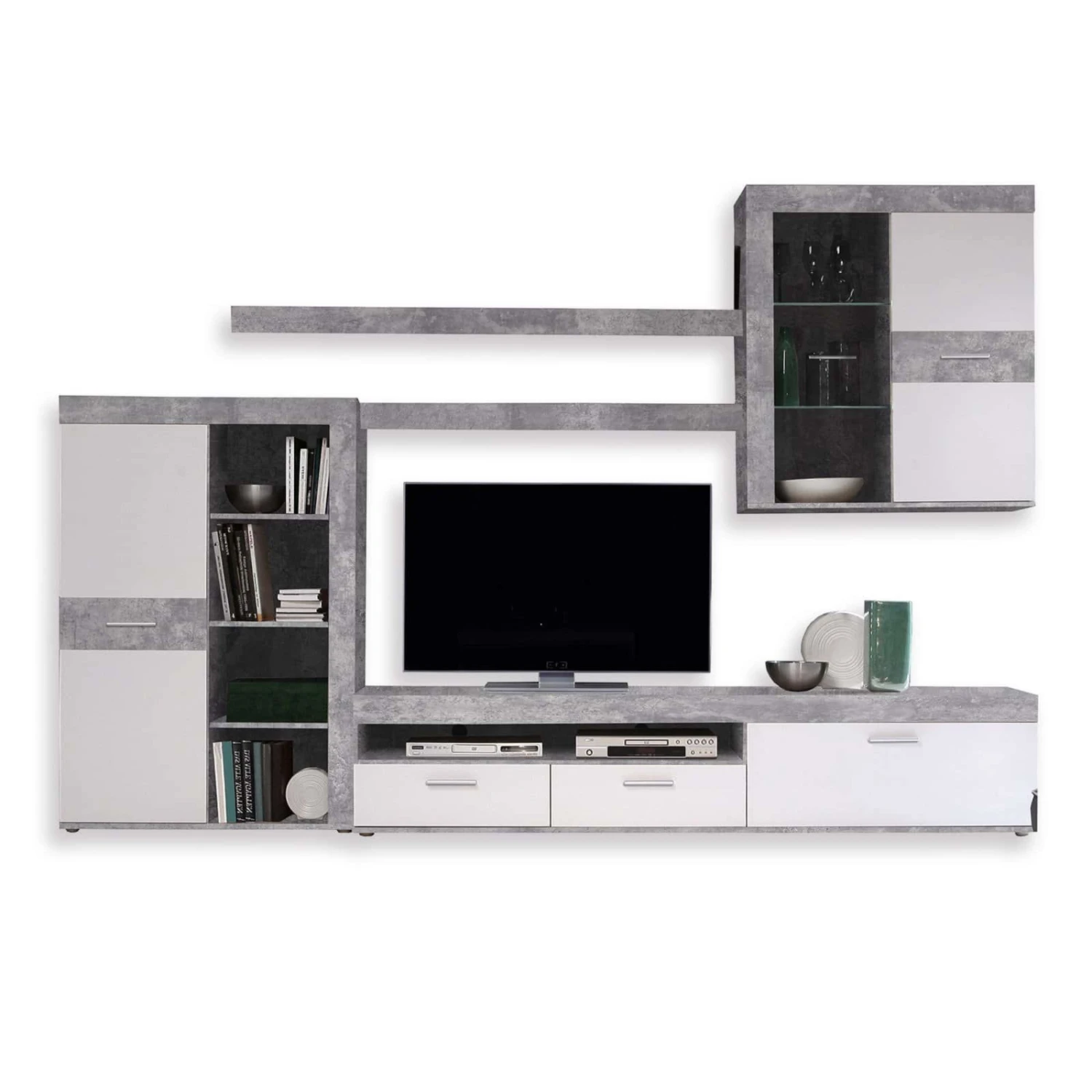 Statten Sie Ihren Wohnbereich mit dieser Wohnwand auf eine moderne Art und Weise aus. Die Kombination aus Betonoptik und der weißen Front wirkt natürlich und doch modern. Ein toller Blickfang für jedes Wohnzimmer mit vielen Möglichkeiten zahlreiche Utensilien unterzubringen oder Dekoration zu platzieren.