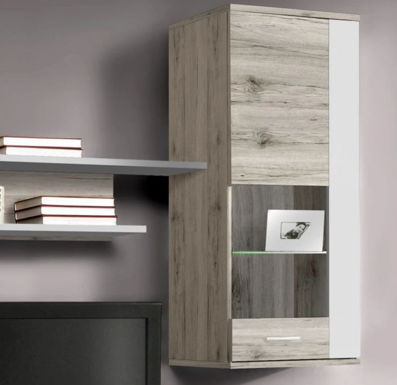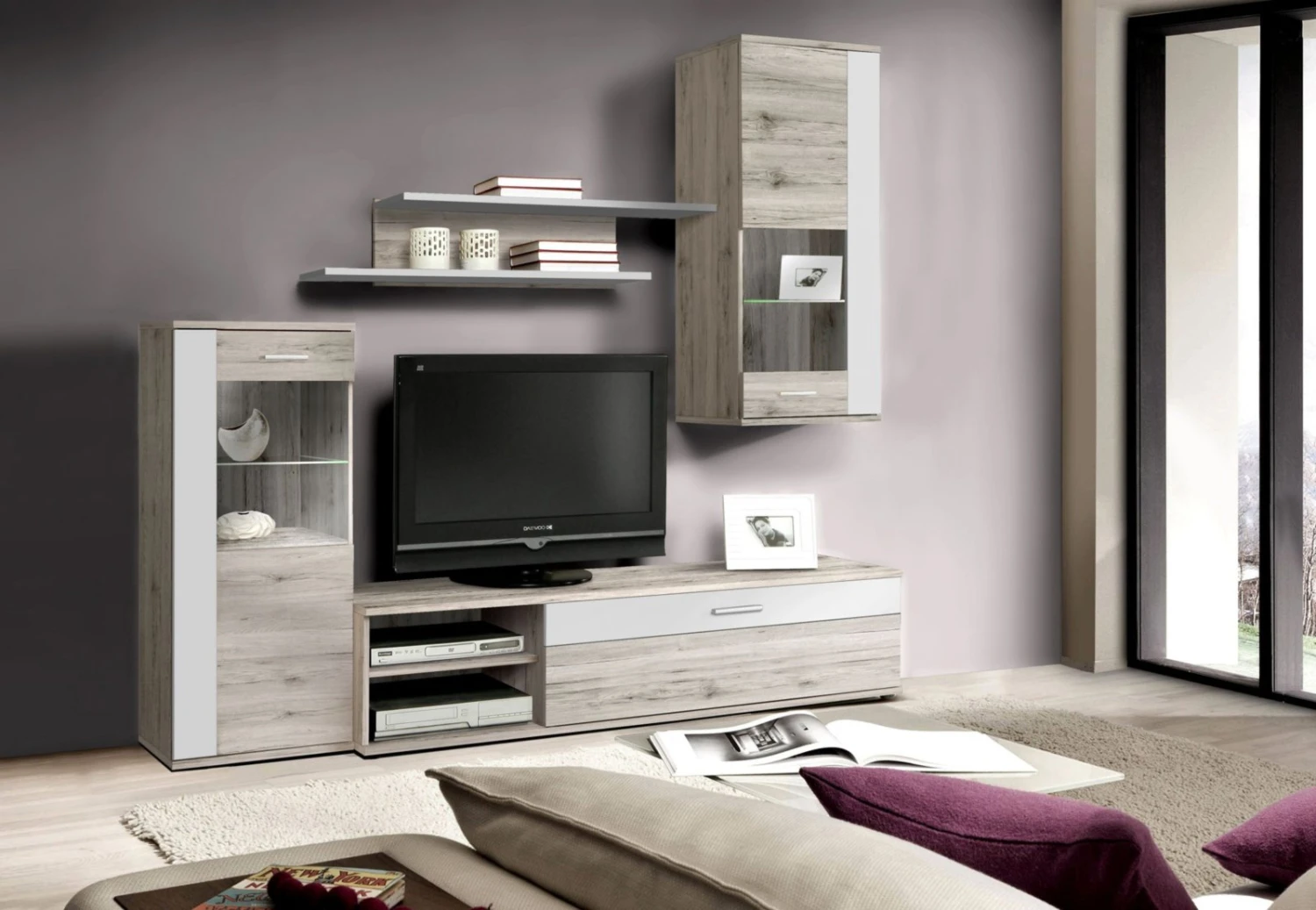 Diese Wohnwand begeistert mit topaktuellem Design und Funktionalität. Die Optik in Sandeiche Dekor und Weiß wirkt frisch, modern und zeitlos zugleich. Die Wohnwand besteht aus einer Kommode, einer Hängevitrine, einem TV-Lowboard und einem Wandboard. Platzieren Sie Ihr TV-Gerät und verstauen Sie zudem allerhand Zubehör. Dank des großzügigen Stauraumangebotes und der sinnigen Aufteilung ist Ordnung halten gar kein Problem. Die im Lieferumfang bereits enthaltene LED-Glasbodenbeleuchtung setzt die Wohnwand perfekt in Szene und schafft ein besonders schönes Raumambiente mit Wohlfühlfaktor.