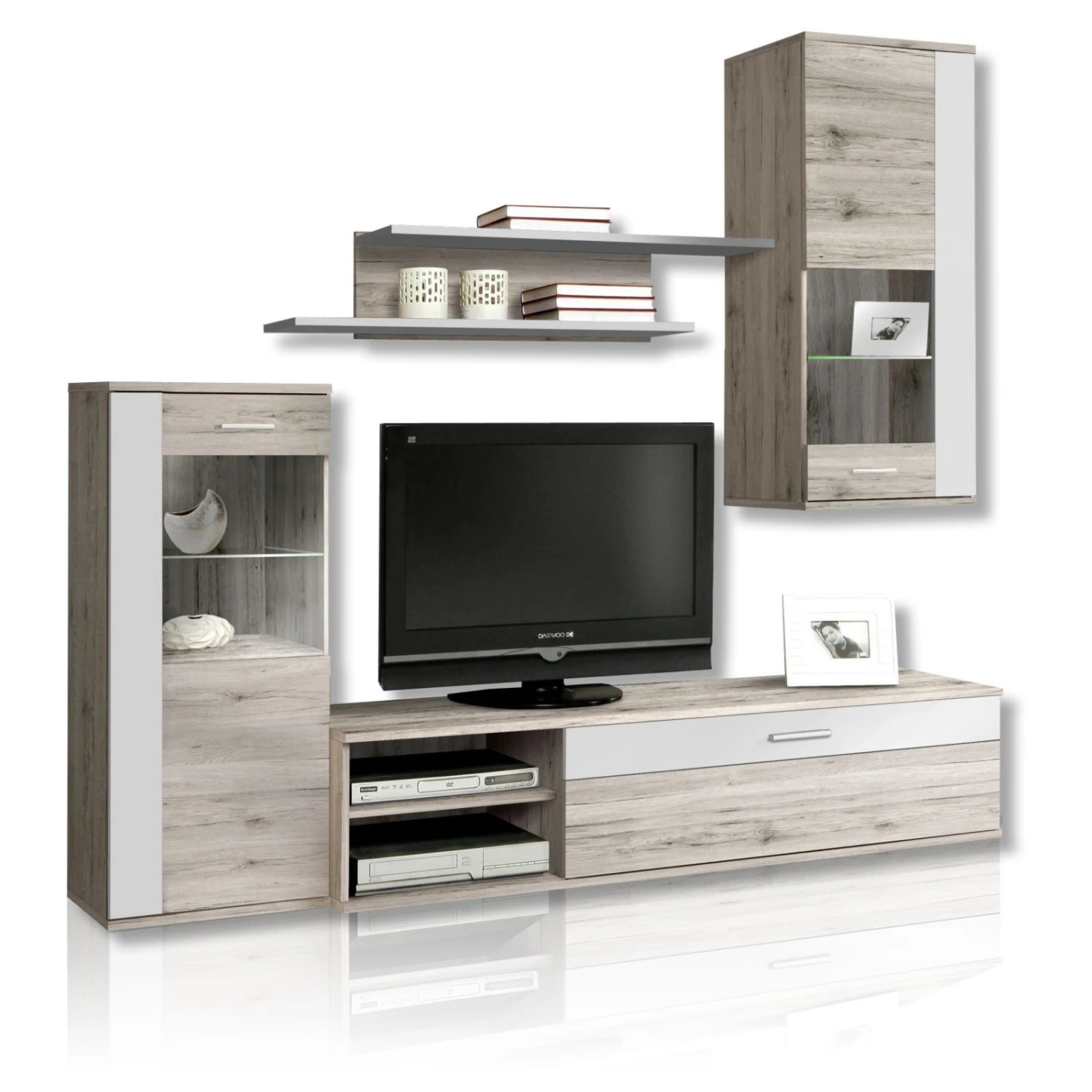Wohnwand – Sandeiche-weiß – 4-teilig – Beleuchtung