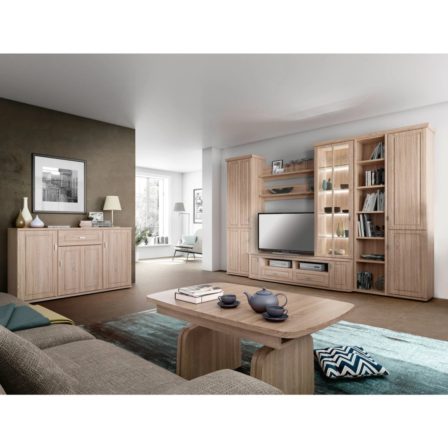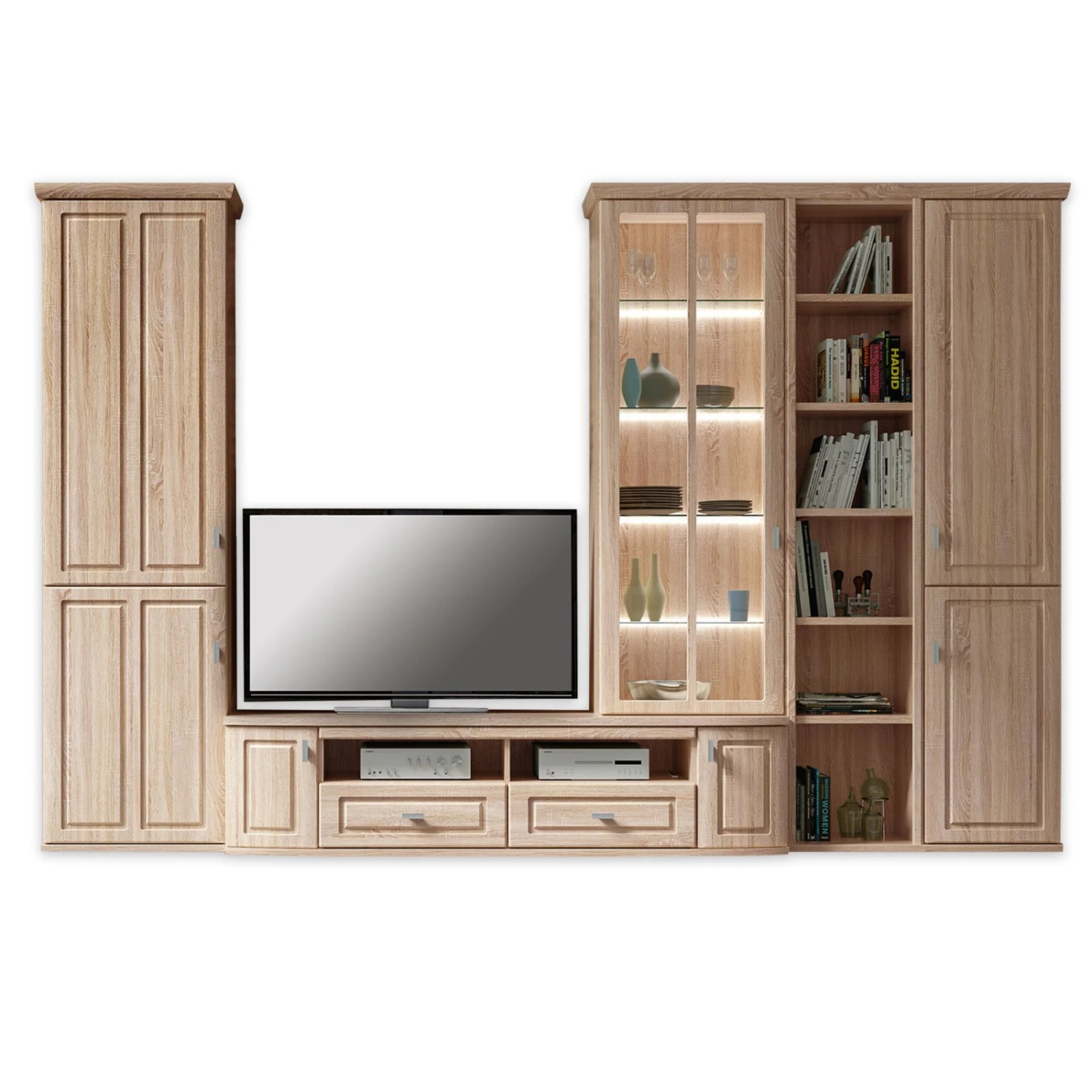 Großzügig geschnittene Wohnwand in Sonoma Eiche Nachbildung. Diese Wohnwand ist mit insgesamt sieben Türen und zwei Schubkästen, sowie mit sechs offenen und zwei Gerätefächern ausgestattet. Sie besteht aus zwei Schränken außen, einem Regal, einer Aufsatzvitrine und einem TV-Lowbard. In der Aufsatzvitrine befinden sich vier Einlegeböden aus Glas und in den anderen Schränken und dem Regal zusammen 15 Einlegeböden aus Holz.