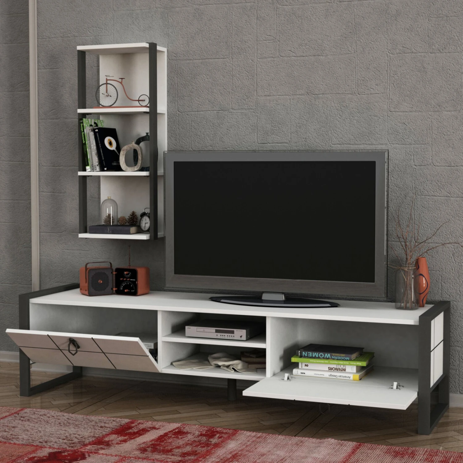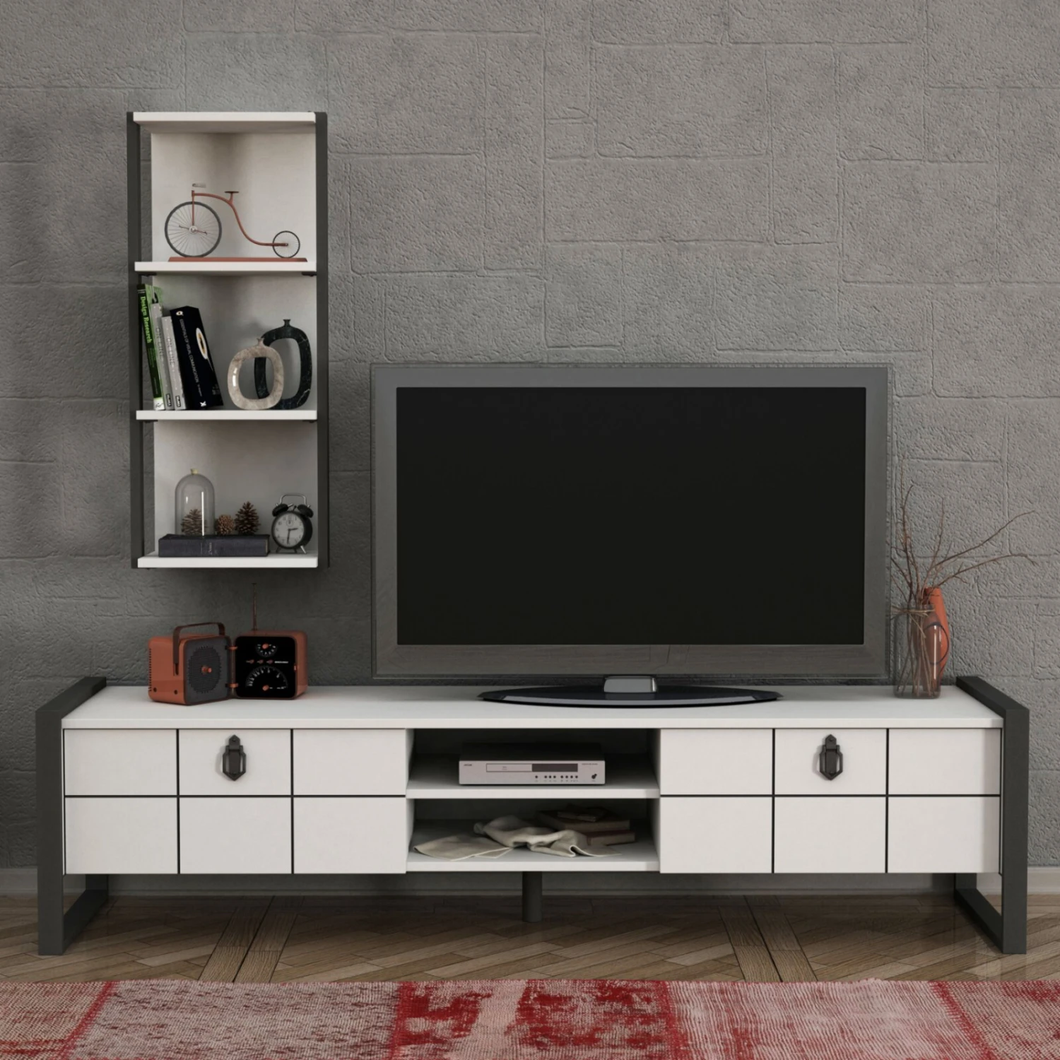 Fügen Sie Ihrem Wohnraum frischen Wind mit der stilvollen und massiven Wohnwand hinzu. Die Kombination aus Holzoptik in Weiß und schwarzen Metallgestell wirken zeitgenössisch und modern. Ein toller Blickfang für jedes Wohnzimmer mit vielen Möglichkeiten z